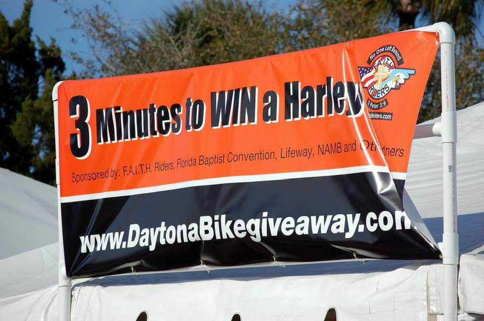 The Florida Baptist Convention, in conjunction with LifeWay, the Southern Baptist retail chain, the Southern Baptist North American Mission Board, and others are giving away free Harley Davidson Motorcycles if you’ll just come to their booth, listen to someone give their testimony, and register.