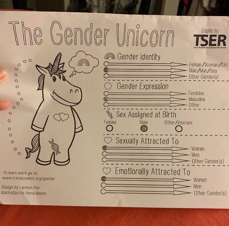 If you haven’t heard of the infamous “Gender Unicorn,” consider yourself in luck. It’s a mini-pamphlet designed by and available at Trans Student Educational Resources which tries to graphically indoctrinate students into perverted transgender ideology. It asks people to fill out a graphical questionnaire to help determine one’s “gender identity.” It’s going around in many public school districts, including a couple of years ago, Charlotte Mecklenburg Schools.