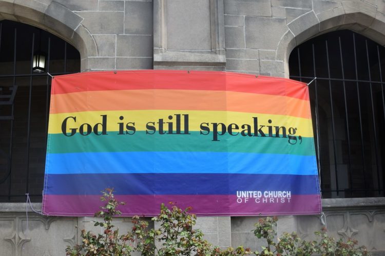 The Rev. Eileen Gebbie, the church’s senior minister, herself a homosexual, said, “The banner featured a rainbow flag with the message, “God is still speaking, it’s a message of inclusion.”