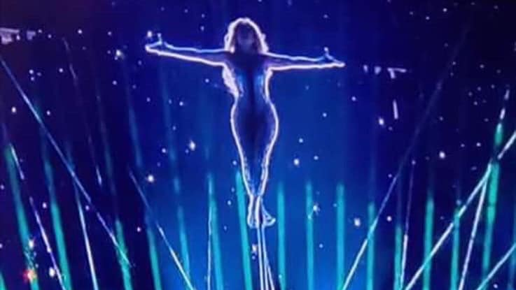 During the show, Lopez put on a pole dance performance and presented herself as a sex object for the world to watch. But what was interesting is that during the performance, it appears she is raised up on what looks like a pose on the cross of Jesus while the surrounding people fall down on their faces in simulated worship.