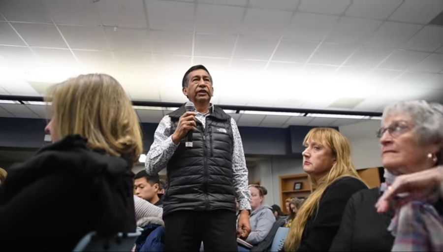 “I remember when I went into his [my son’s] bedroom to say goodnight and he was crying because of the abuse he has endured in this school system,” Adrian Iraola tells the crowd at the meeting.