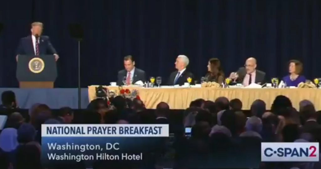 “I don’t like people who use their faith as justification for doing what they know is wrong,” Trump said during the prayer breakfast speech, “Nor do I like people who say ‘I pray for you’ when they know that that’s not so.”