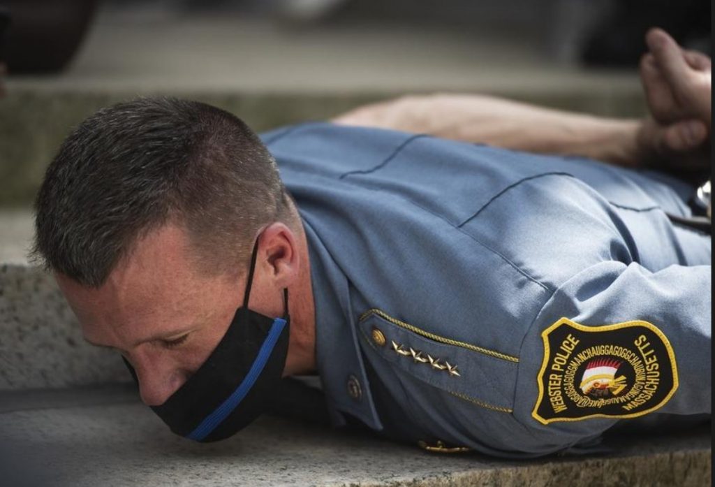 Okay, wait. That’s not true. Let’s rephrase that. In Webster, MA, police chief, Michael Shaw joined a bunch of other white virtue-signalers in laying down on his belly to surrender to militant anarchist groups like Black Lives Matter for nothing more than the grave sin of being born white. It’s not a joke. It’s not satire. Police departments around the country are caving in to the demands of extremists that have taken over the narrative of injustice and exploited the death of George Floyd for nothing other than political gain.