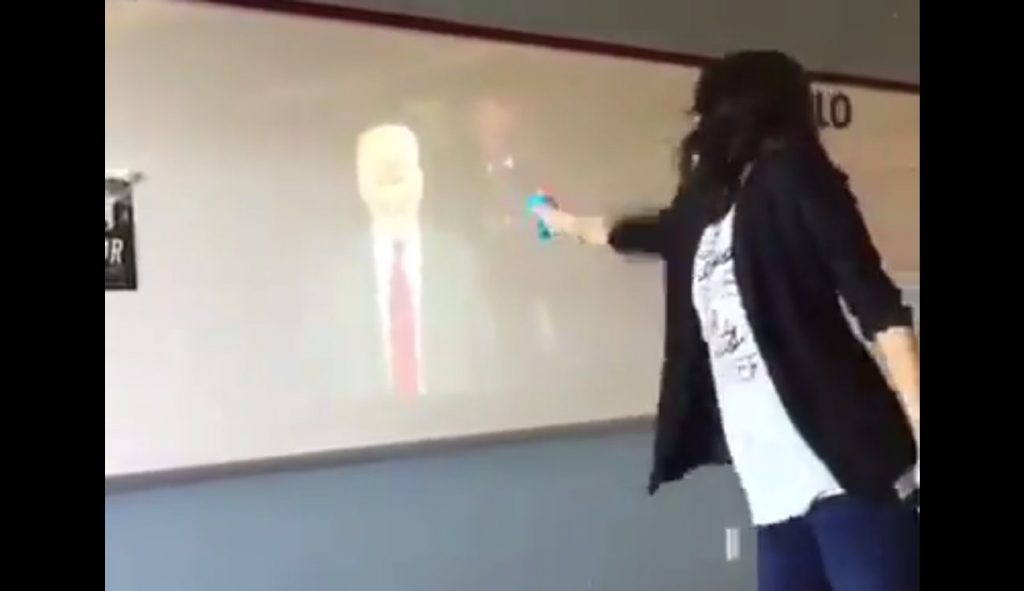 A public high school teacher at W.H. Madison High School In Dallas, TX, stands in front of her class while President Donald Trump is on a projector screen and pretends to shoot him with a toy gun while yelling “die!”
