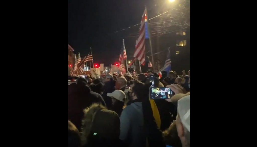 Following Presti’s arrest, hundreds of protesters gathered to show their support for freedom and the bar owner’s rights to open and conduct business without fear of retaliation by government tyrants, chanting “USA, USA, USA!”