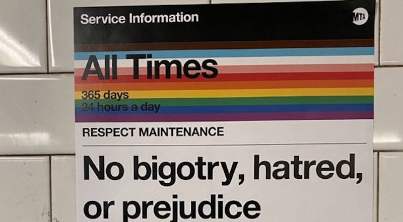 The New York public transportation authority–a government agency that oversees the administration of public transportation–has posted signs that essentially threaten to end the life of people who are disrespectful toward “transgender” people.
