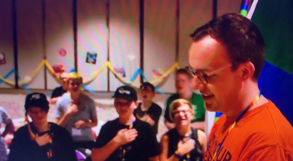 I will not profane God’s ancient and sacred covenant of marriage by referring to Chasten Buttigieg as Pete’s “husband”—he is but merely a fornicator who is being used as a tool of God’s wrath to bring judgment upon this nation which has turned her back on Him. So, as the title states, Buttigieg’s gay lover, Chasten, leads children in a pledge of allegiance to the gay pride flag.