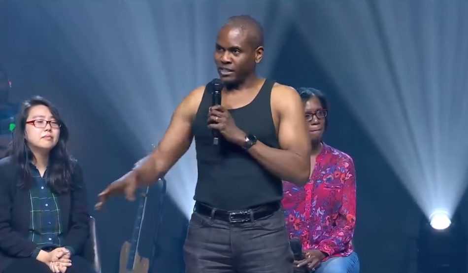He then explains that God told him to go into his garage and lay face down next to his car. So he went to his garage and started weeping. From this point, well, you’ll just have to watch the video yourself to see the complete meltdown he has on stage re-enacting the death of George Floyd.