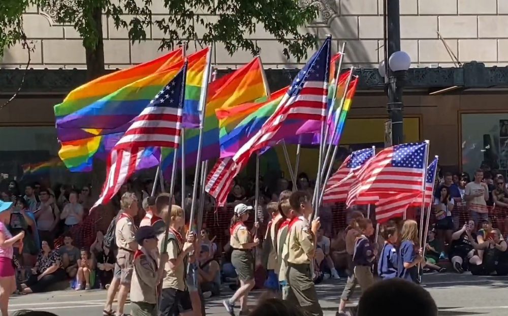 In Seattle’s “Gay Pride” march on Sunday, the Boy Scouts participated, carrying pride flags alongside the American flag as crowds of people stand around and clap and cheer.