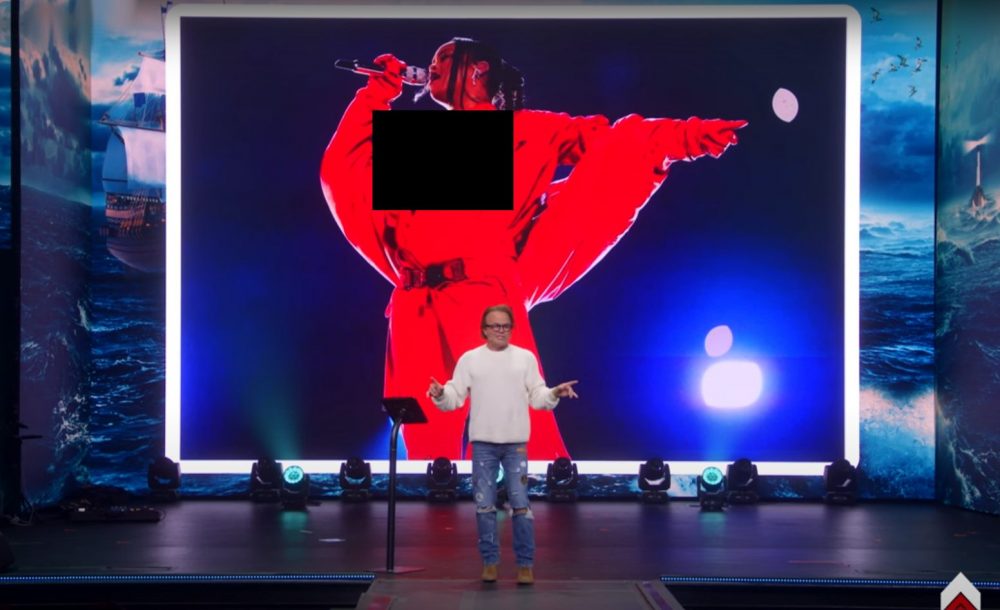 But in a more recent sermon, Crank stands in front of a glaring image of pop-star singer Rihanna with her breasts almost completely out while he preaches about the Superbowl.