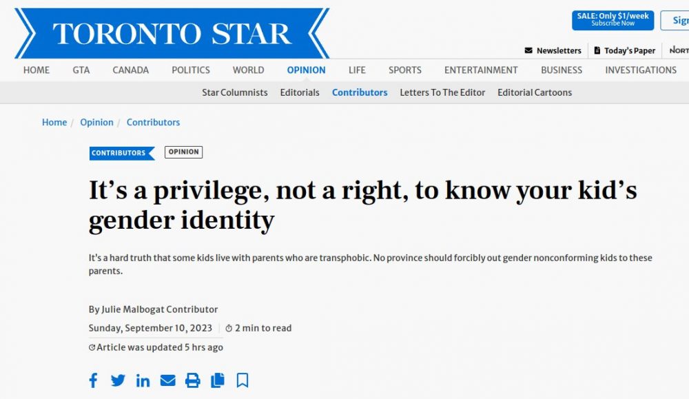 It’s beyond troubling to see the lengths to which some are willing to go to strip away parental rights under the guise of modern progressivism. In fact, it’s horrifying. When I first read the headline, “It’s a privilege, not a right, to know your kid’s gender identity,” published in the Toronto Star, it was like a sucker punch of twisted logic and shameless brash. My first thought: all you suckers fell for it—they told you they weren’t coming for your children and you believed them.