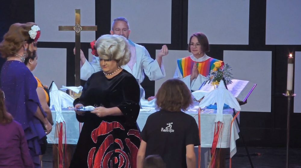 This isn’t just a quirky church service. It’s a blatant mockery of not just public decency but of God Himself. They had men dressed up as women, belting out songs and preaching from the pulpit like it was the most natural thing in the world. Natural? And of course, the priestess of Satan herself is decked on in a rainbow stole and garb. You’ve got to be kidding me.
