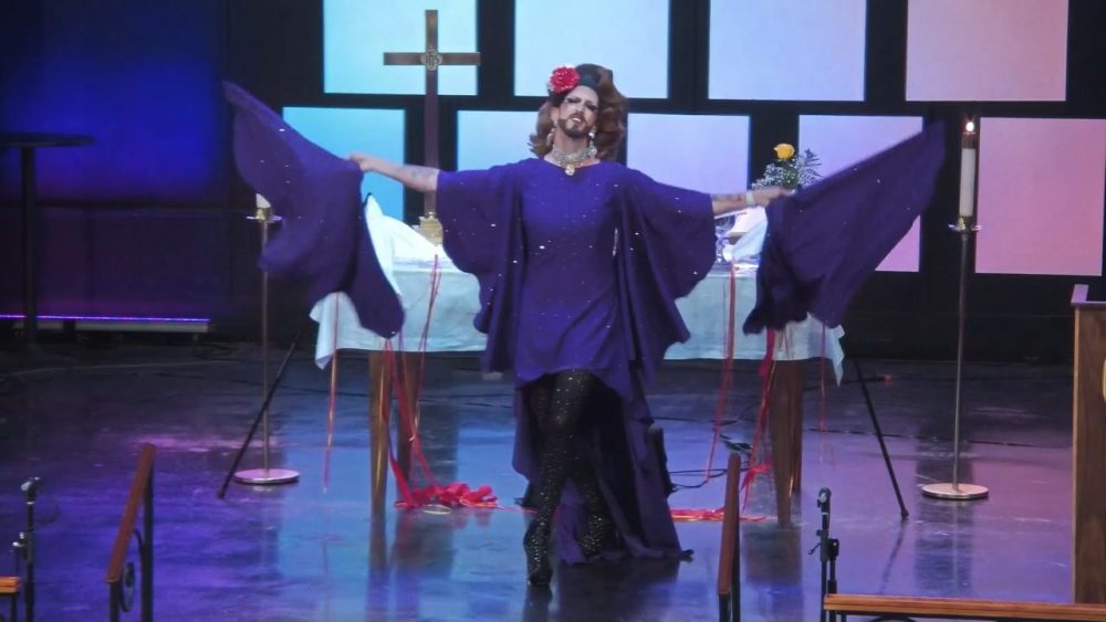 But in case you didn’t want to watch the entire two hour service, here’s just a little glimpse of what you all missed—a drag queen, a man dressed up as a woman, performing a flag dance during the sermon for everyone, including little children, to view.